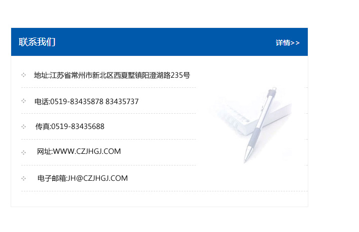 地址:常州市新北區友邦商務大廈1幢16、17層  電話:0519-85101652  傳真:0519-85112595  郵編:213022  網址:www.cz-jiayue_cn.sxctx.com  郵箱:xiajifengaa@163.com